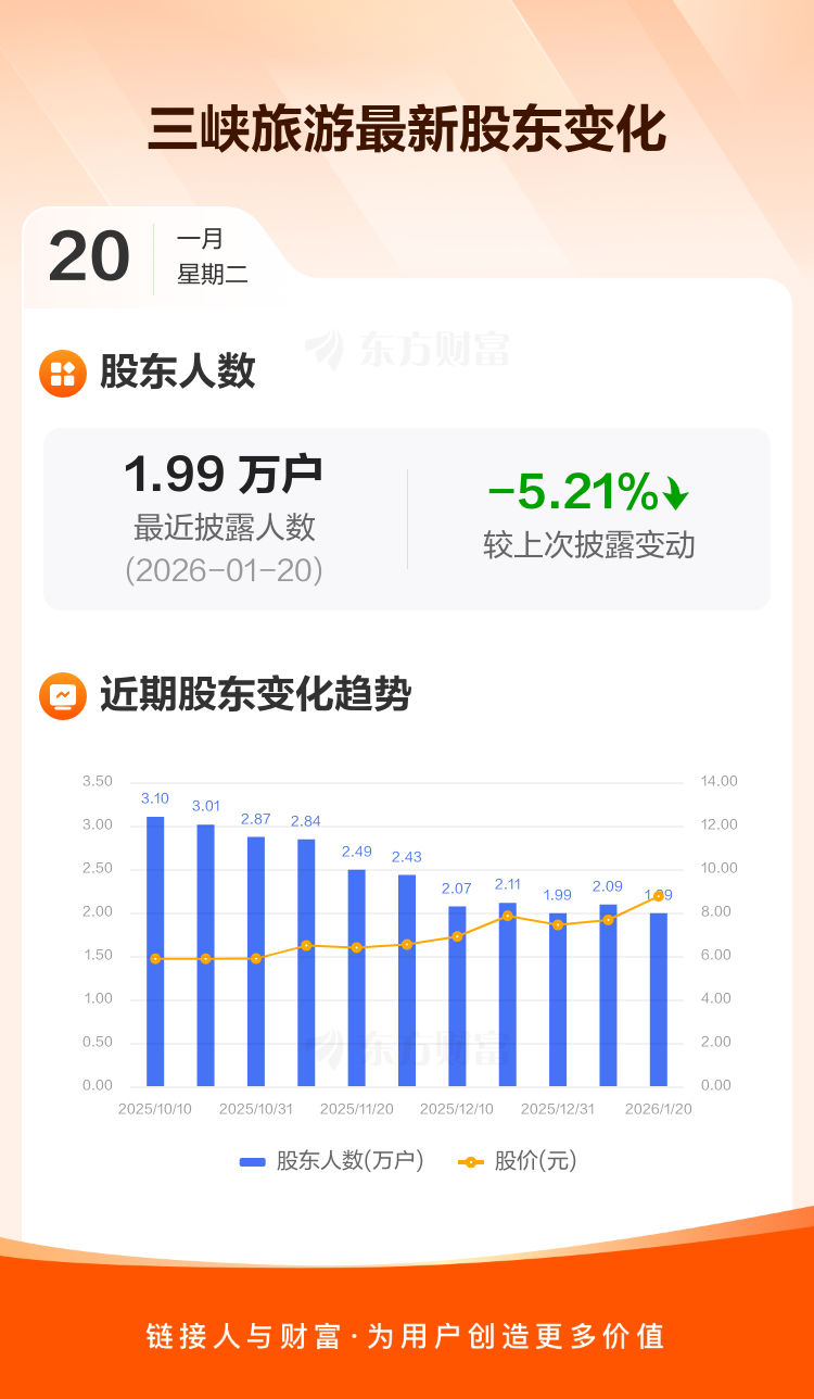 三峡旅游最新披露数据显示,截至1月20日公司股东户数为1.99万户,较上期(2026年1月9日)减少1091户,降幅为5.21%。户均持有流通股数量由上期的3.42万股上升至3.61万股,户均持股金额由上期的26.19万元增加至31.56万元。