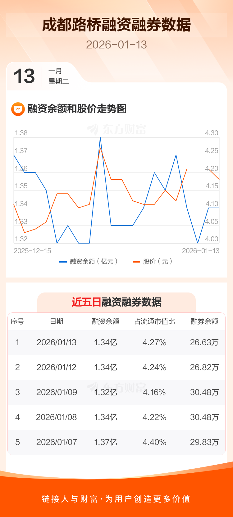 交易所最新数据显示,成都路桥于2026年1月13日获融资买入624.15万元,融资偿还620.53万元,当日融资净买入3.62万元。目前,该股融资余额1.34亿,占流通市值比例为4.27%。