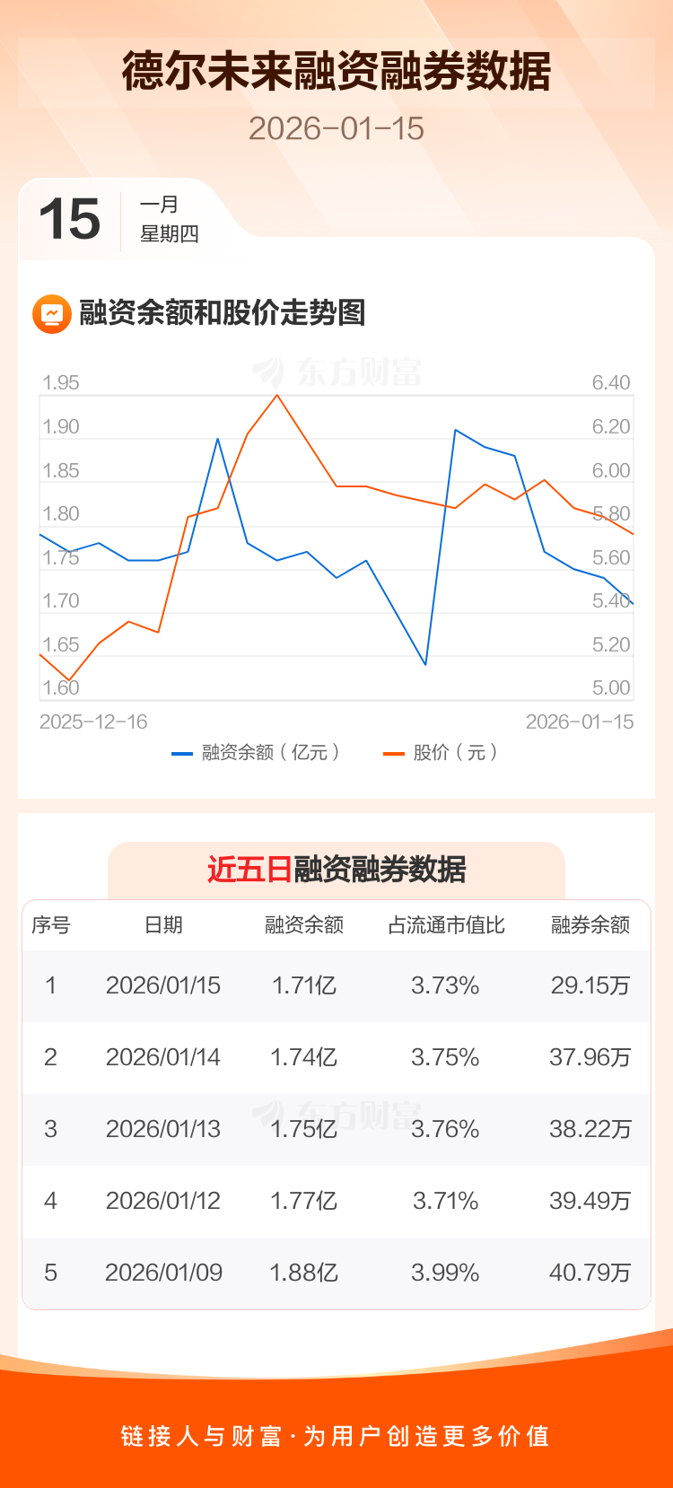 交易所最新数据显示,德尔未来于2026年1月15日获融资买入733.61万元,融资偿还1023.91万元,当日融资净偿还290.3万元。目前,该股融资余额1.71亿,占流通市值比例为3.73%。