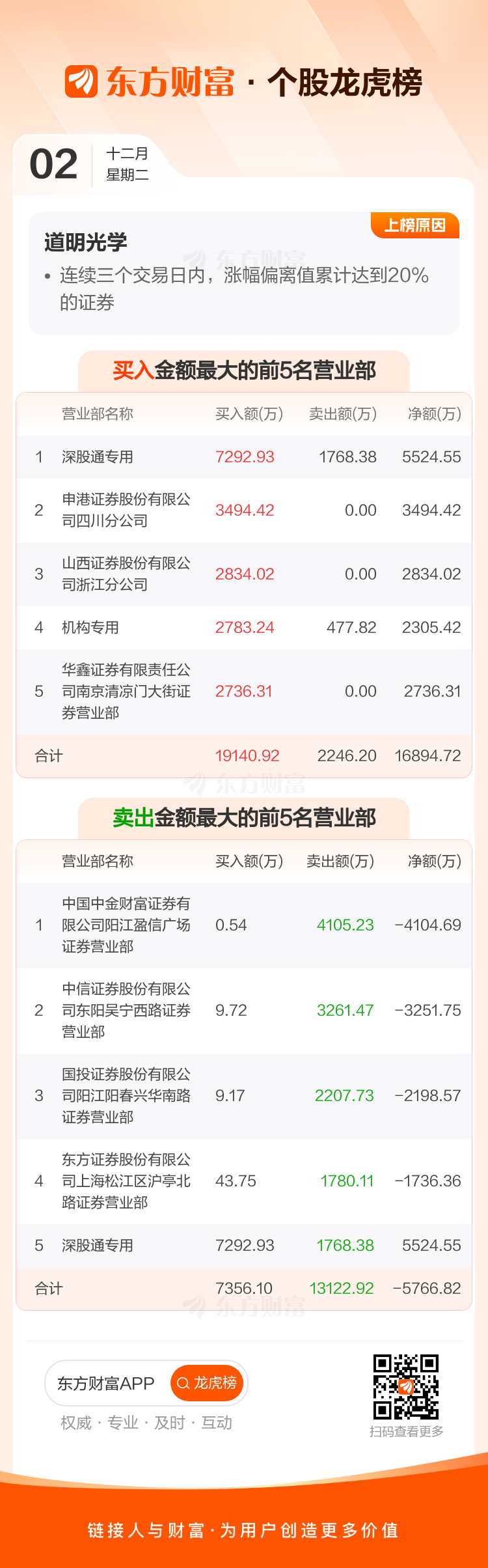 交易所2025年12月2日公布的交易公开信息显示,道明光学因成为连续三个交易日内,涨幅偏离值累计达到20%的证券上榜。道明光学当日收报15.05元,涨跌幅10.01%,换手率1.20%,成交额1.06亿。异常期间12月1日至12月2日,期间涨幅20.98%,累计偏离值20.64%,区间成交额12.23亿。
