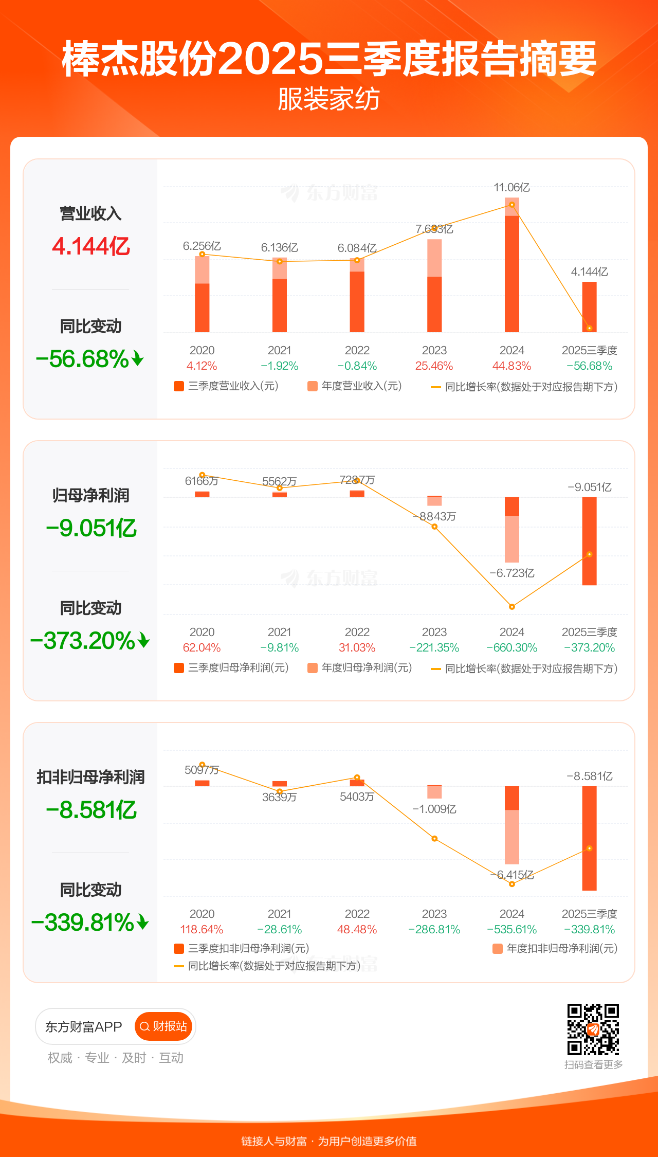 棒杰股份10月29日发布2025年三季报显示,公司前三季实现营业收入4.14亿元,同比下滑56.68%;归母净利润-9.05亿元;扣非归母净利润-8.58亿元。