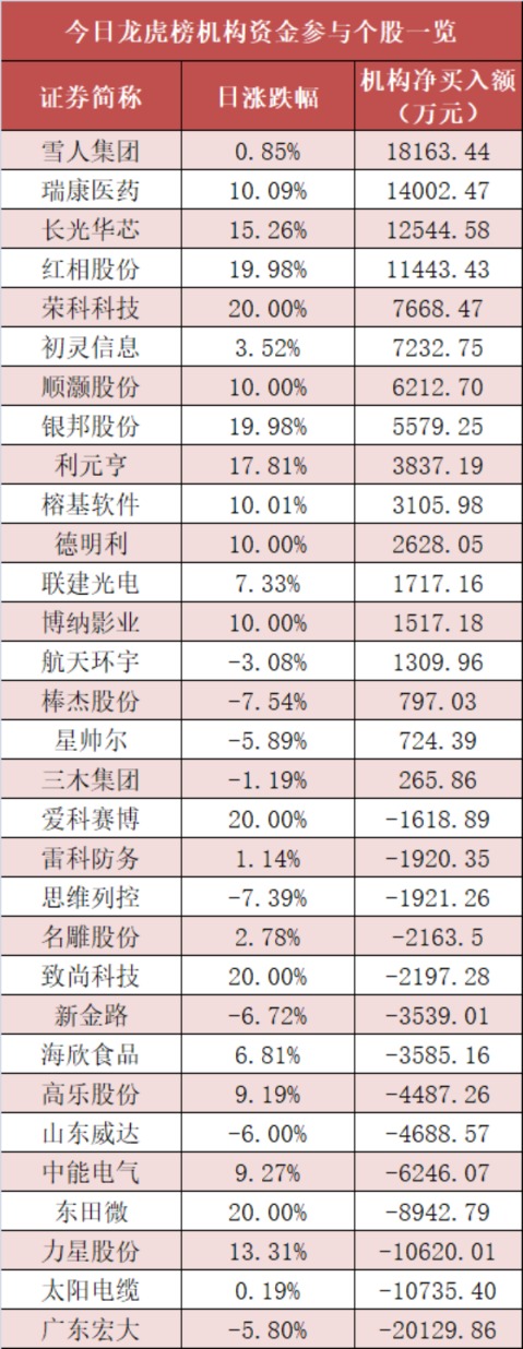 盘后龙虎榜数据显示,机构现身多股,其中雪人集团等股票呈现机构资金净买入,广东宏大等股票呈现机构资金净卖出。