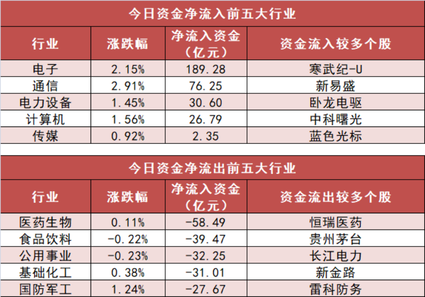 申万一级行业中,7个行业实现资金净流入,其中电子行业净流入189.28亿元居首。