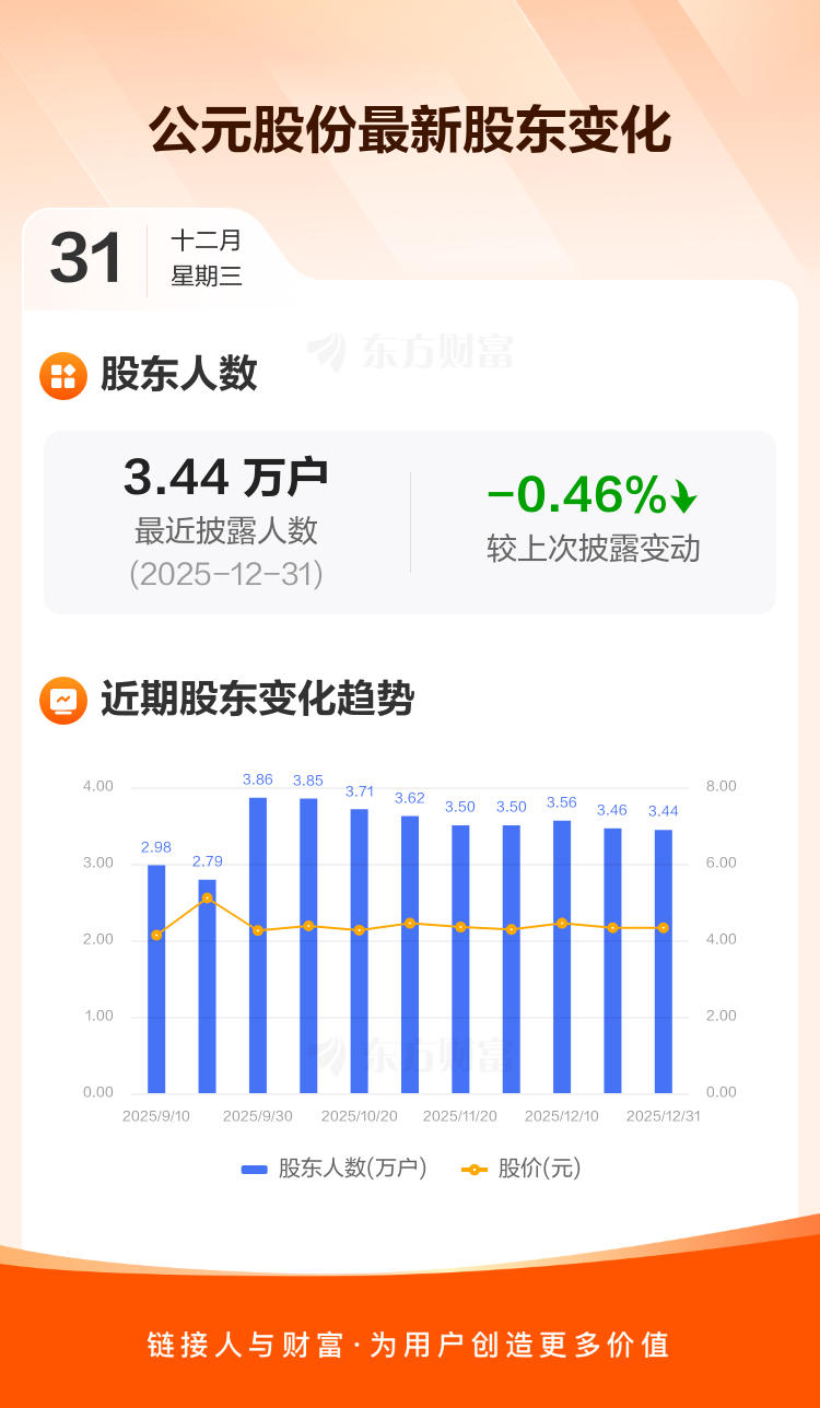公元股份最新披露数据显示,截至12月31日公司股东户数为3.44万户,较上期(2025年12月19日)减少158户,降幅为0.46%。户均持有流通股数量由上期的3.28万股上升至3.29万股,户均持股金额由上期的14.16万元增加至14.22万元。