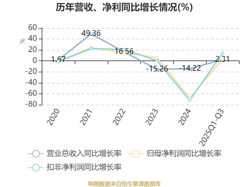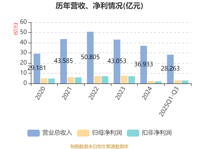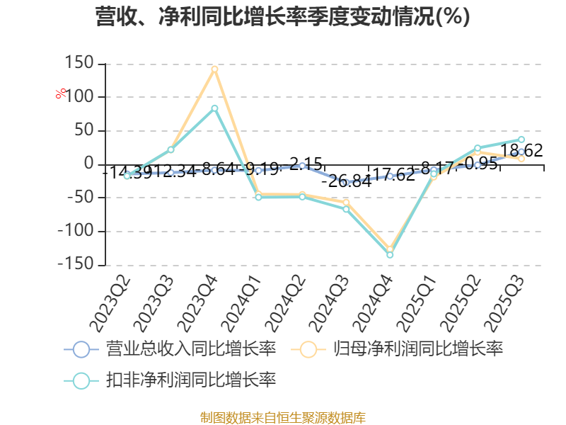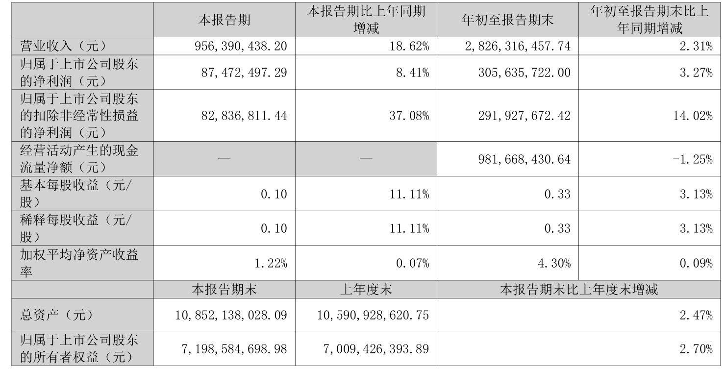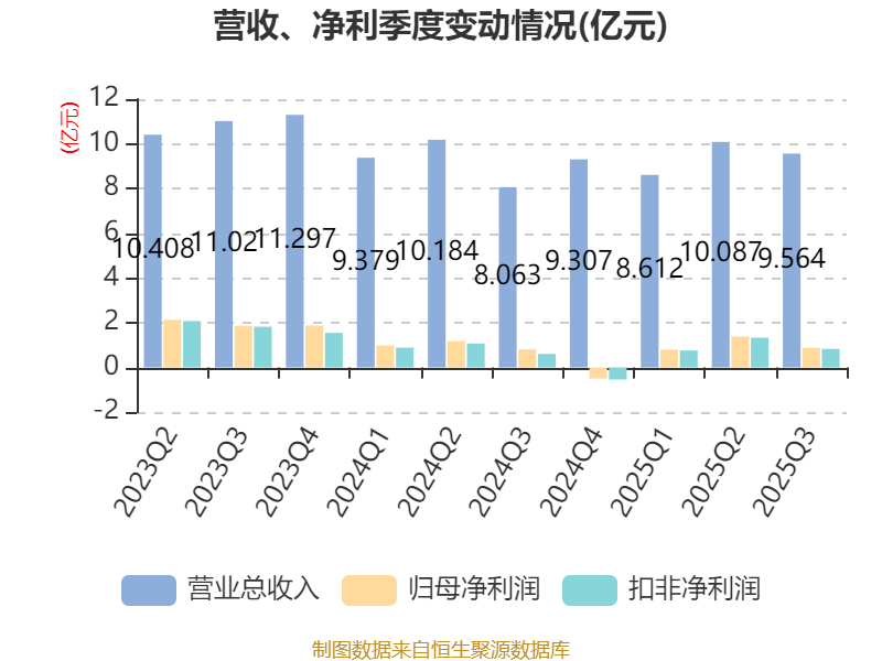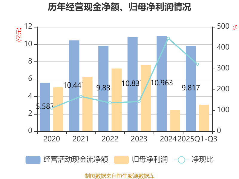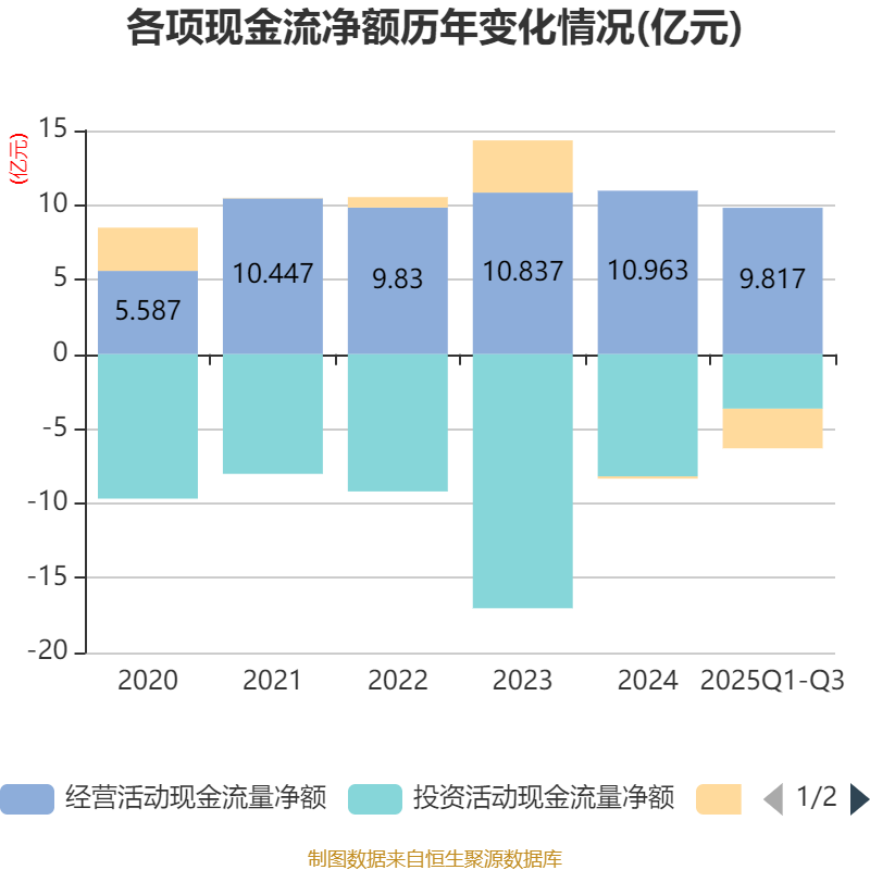 2025年前三季度,公司经营活动现金流净额为9.82亿元,同比下降1.25%;筹资活动现金流净额-2.66亿元,同比减少3.97亿元;投资活动现金流净额-3.65亿元,上年同期为-4.06亿元。