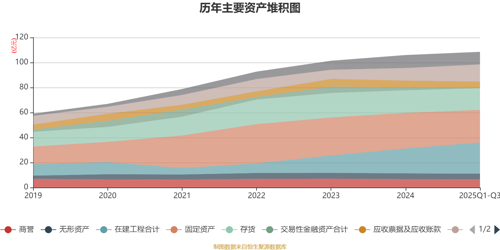 资产重大变化方面,截至2025年三季度末,公司在建工程合计较上年末增加25.21%,占公司总资产比重上升4.18个百分点;货币资金较上年末增加36.65%,占公司总资产比重上升3.17个百分点;固定资产较上年末减少8.91%,占公司总资产比重下降3个百分点;交易性金融资产合计较上年末减少100%,占公司总资产比重下降2.17个百分点。