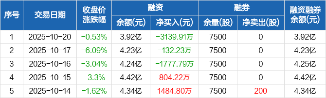 融资方面,当日融资买入2885.28万元,融资偿还6025.19万元,融资净偿还3139.91万元,连续3日净偿还累计5049.92万元。融券方面,融券卖出0股,融券偿还0股,融券余量7500股,融券余额11.16万元。融资融券余额合计3.92亿元。