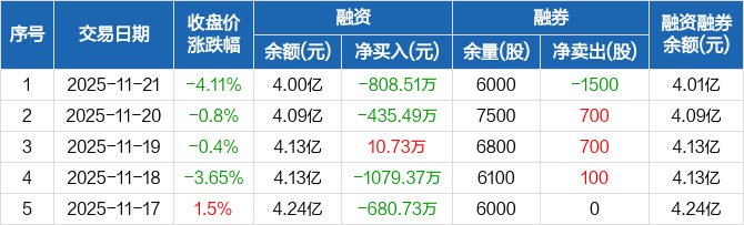 华宏科技:融资净偿还808.51万元,融资余额4亿元(11-21)