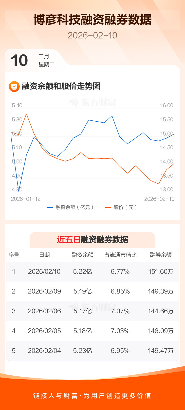 交易所最新数据显示,博彦科技于2026年2月10日获融资买入2954.66万元,融资偿还2674.26万元,当日融资净买入280.4万元。目前,该股融资余额5.22亿,占流通市值比例为6.77%。