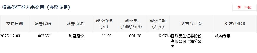 利君股份今日大宗交易折价成交601.28万股,成交额6974.81万元