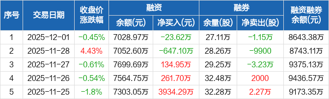 海思科:融资净偿还23.62万元,融资余额7028.97万元(12-01)