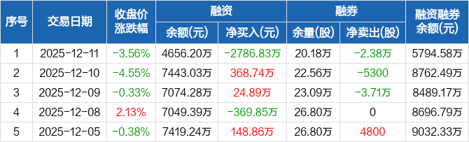 海思科融资融券信息显示,2025年12月11日融资净偿还2786.83万元;融资余额4656.2万元,较前一日下降37.44%,降幅两市第五。