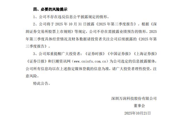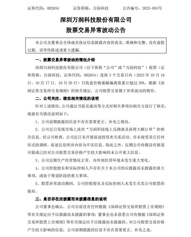 万润科技(002654.SZ)发布股票交易异常波动公告称,公司近日发现市场上流传“万润科技线上反路演及获得大额订单”的相关信息,经公司核查,公司近日未开展前述投资者关系活动、亦未接受其它任何形式的调研,前述信息所涉内容为不实信息。除此之外,近期公共传媒没有报道可能或已经对公司股票交易价格产生较大影响的未公开重大信息。