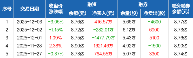 万润科技:融资净买入416.57万元,融资余额8.76亿元(12-03)