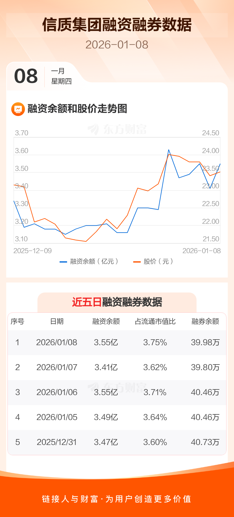 交易所最新数据显示,信质集团于2026年1月8日获融资买入3607.93万元,融资偿还2198.03万元,当日融资净买入1409.9万元。目前,该股融资余额3.55亿,占流通市值比例为3.75%。