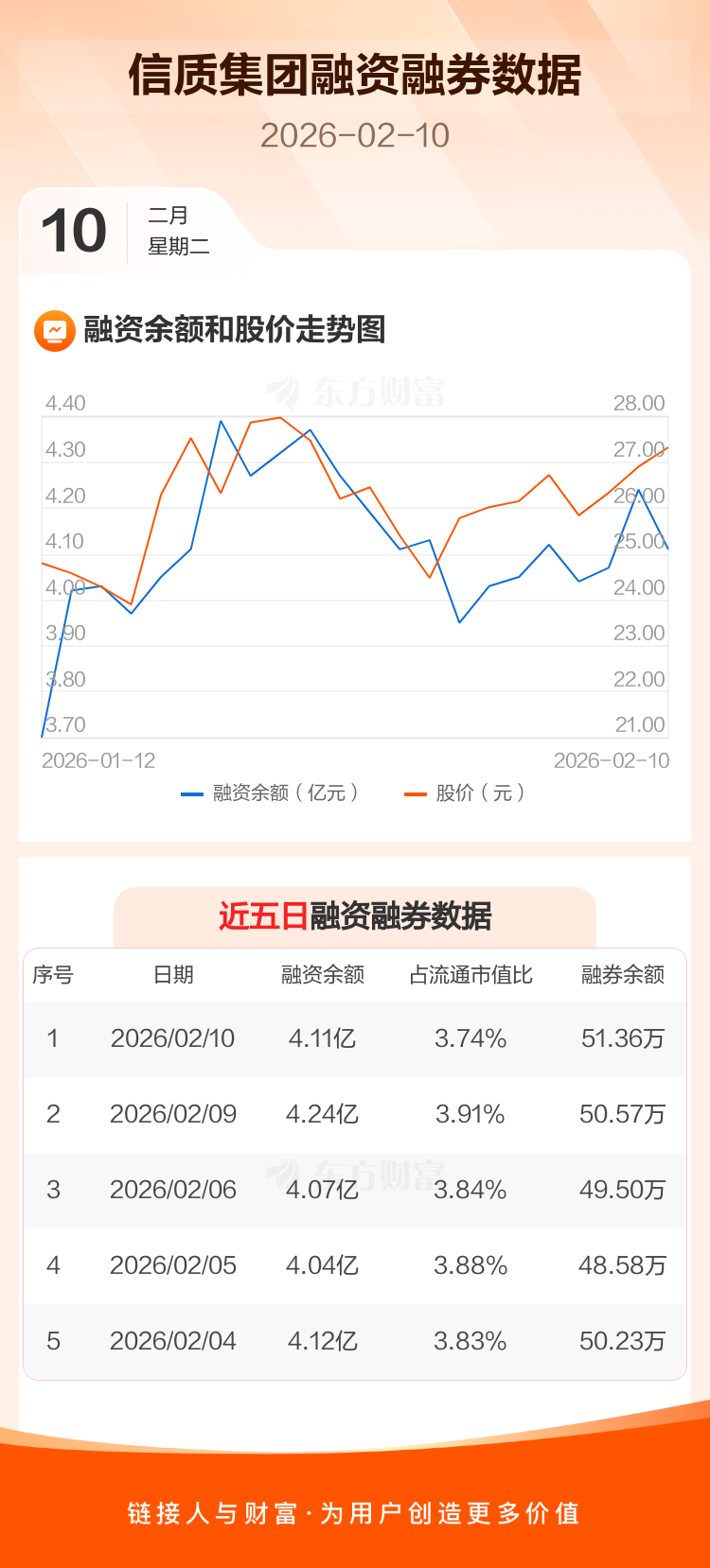 交易所最新数据显示,信质集团于2026年2月10日获融资买入3830.83万元,融资偿还5088.68万元,当日融资净偿还1257.84万元。目前,该股融资余额4.11亿,占流通市值比例为3.74%。