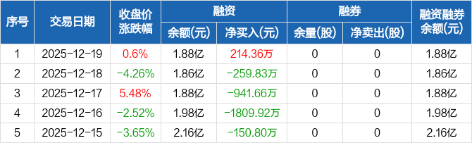 威领股份:融资净买入214.36万元,融资余额1.88亿元(12-19)