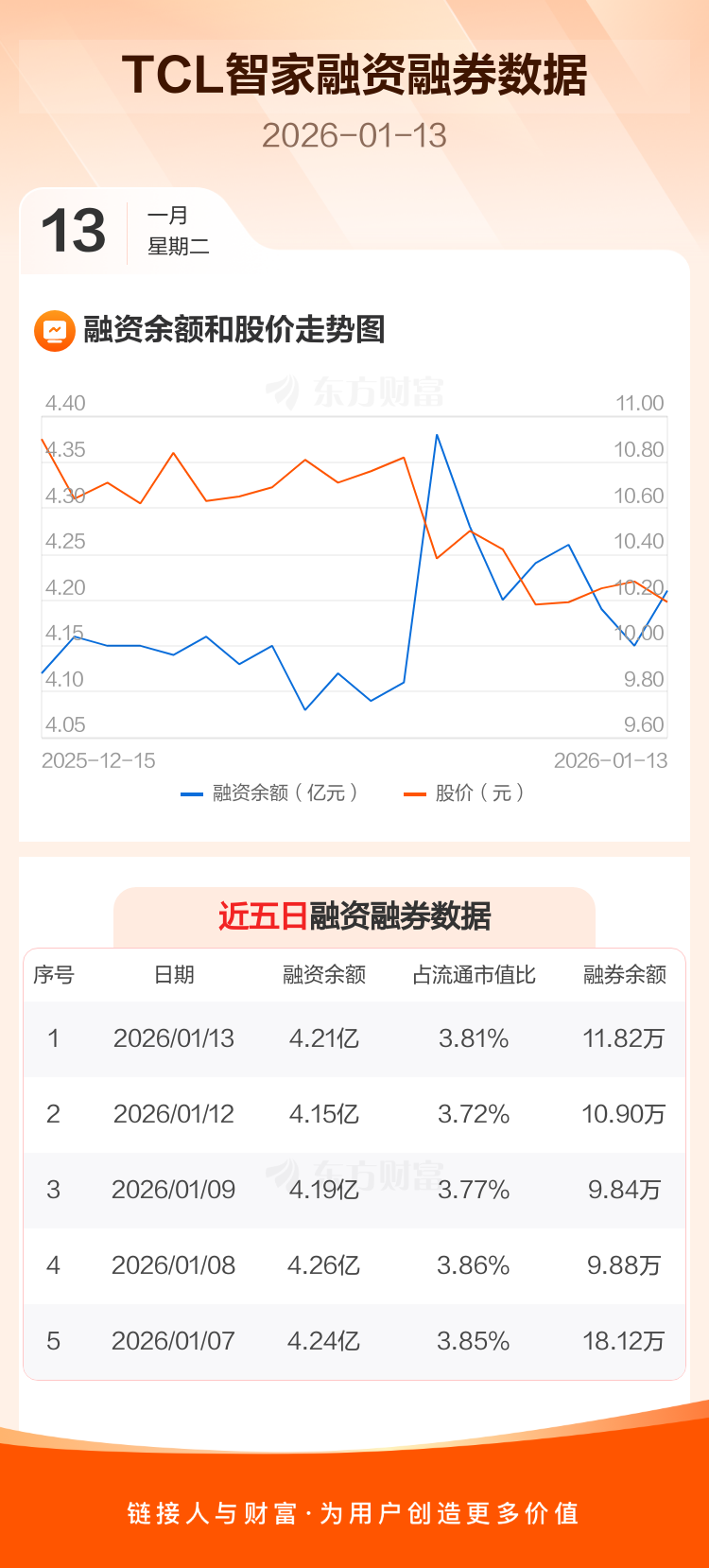 交易所最新数据显示,TCL智家于2026年1月13日获融资买入2066.51万元,融资偿还1418.14万元,当日融资净买入648.37万元。目前,该股融资余额4.21亿,占流通市值比例为3.81%。