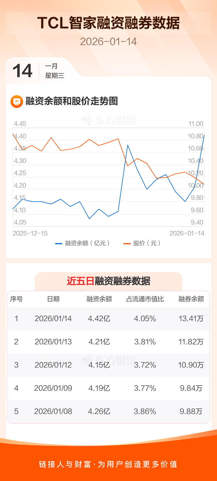 交易所最新数据显示,TCL智家于2026年1月14日获融资买入3579.54万元,融资偿还1498.35万元,当日融资净买入2081.18万元。目前,该股融资余额4.42亿,占流通市值比例为4.05%。