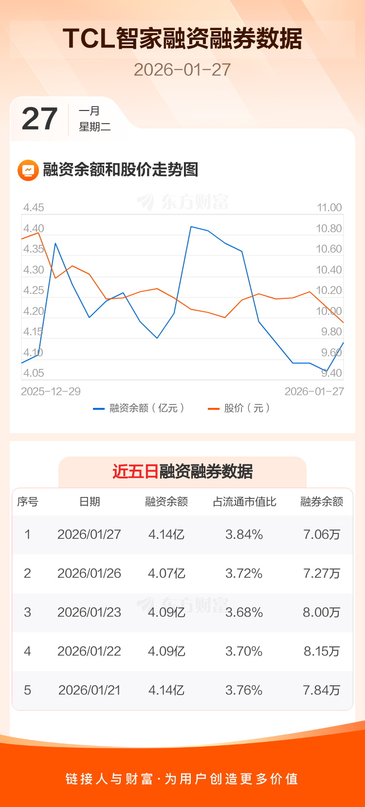 交易所最新数据显示,TCL智家于2026年1月27日获融资买入1438.80万元,融资偿还775.03万元,当日融资净买入663.77万元。目前,该股融资余额4.14亿,占流通市值比例为3.84%。