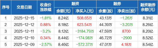 融资方面,当日融资买入3334.84万元,融资偿还2826.18万元,融资净买入508.65万元。融券方面,融券卖出2400股,融券偿还1.5万股,融券余量43.13万股,融券余额724.58万元。融资融券余额合计8.31亿元。