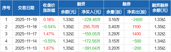 融资方面,当日融资买入580.98万元,融资偿还809.44万元,融资净偿还228.46万元。融券方面,融券卖出400股,融券偿还2800股,融券余量3.16万股,融券余额17.35万元。融资融券余额合计1.33亿元。