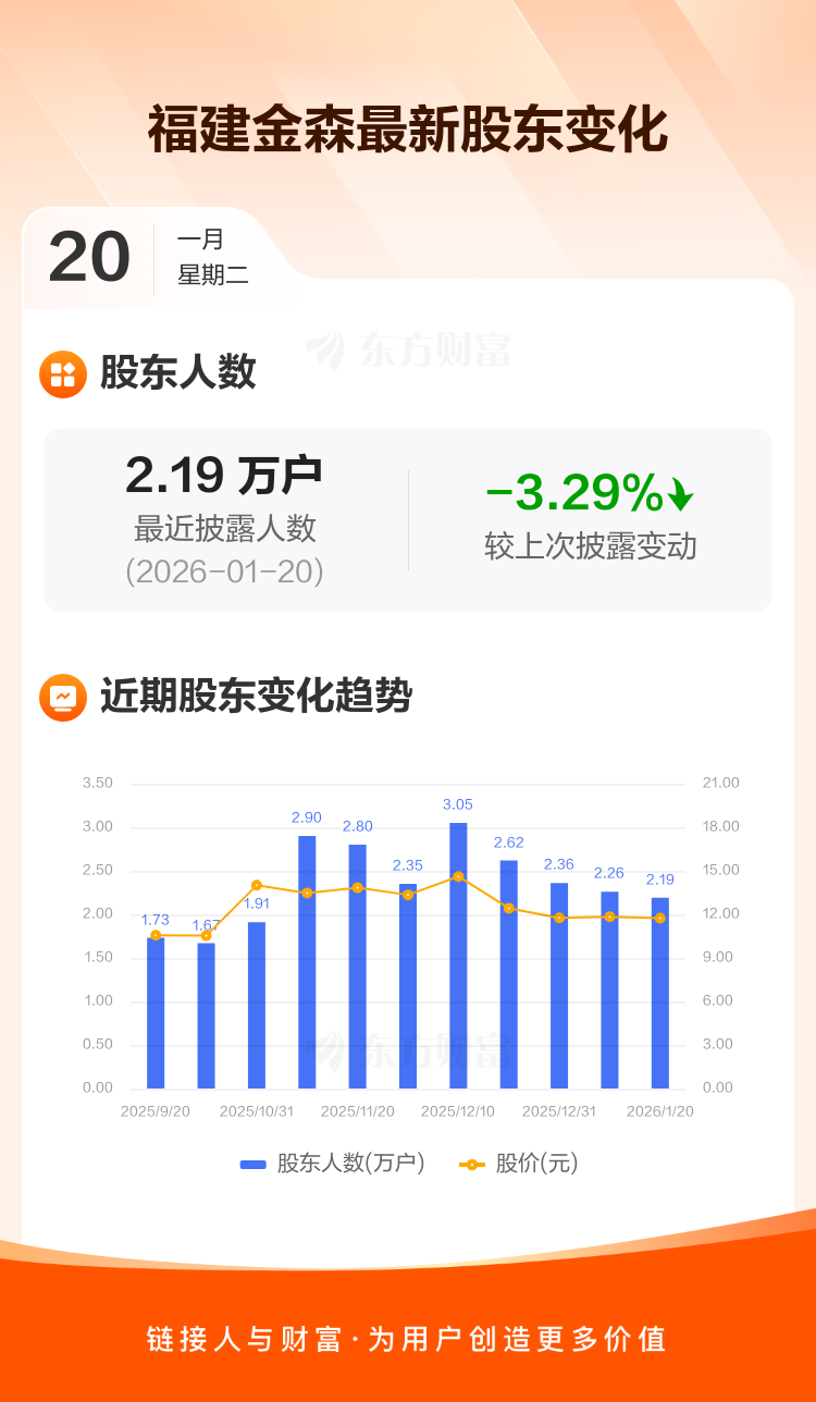 福建金森:截至1月20日最新股东户数2.19万户,较上期减少3.29%