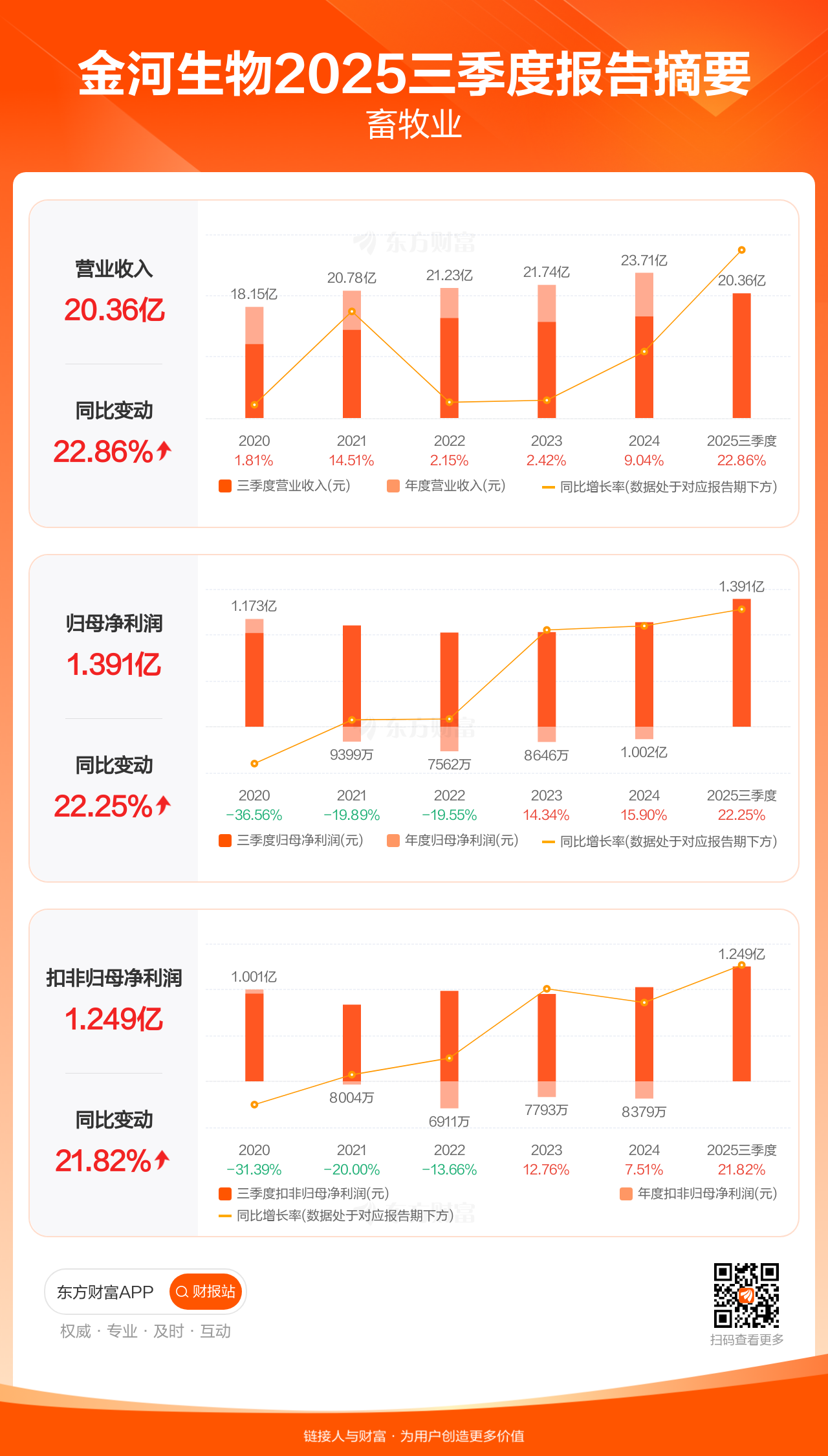 金河生物10月30日发布2025年三季报显示,公司前三季实现营业收入20.36亿元,同比增长22.86%;归母净利润1.39亿元,同比增长22.25%;扣非归母净利润1.25亿元,同比增长21.82%。