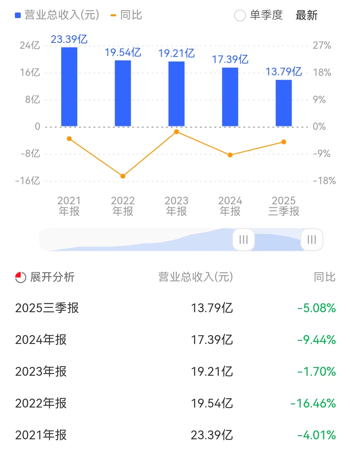 2021年~2024年,公司营收分别为23.39亿元、19.54亿元、19.21亿元、17.39亿元,同比分别下降4.01%、16.46%、1.7%、9.44%。