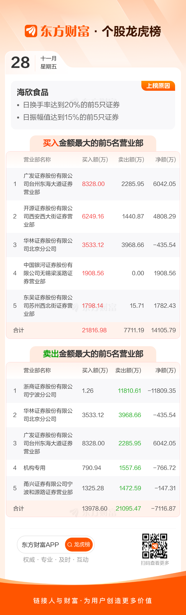 交易所2025年11月28日公布的交易公开信息显示,海欣食品因成为日换手率达到20%的前5只证券、日振幅值达到15%的前5只证券上榜。海欣食品当日收报7.24元,涨跌幅10.03%,偏离值40.07%,换手率40.07%,成交额11.78亿。