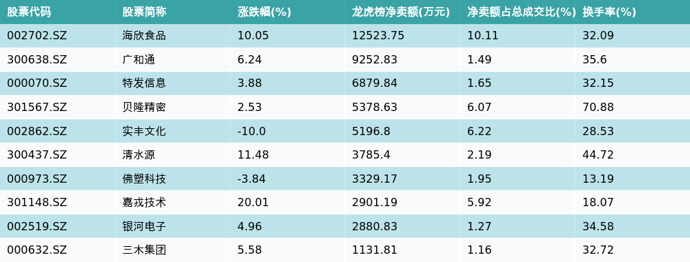 南财智讯12月2日电,南财金融终端数据显示,因当日异动登上龙虎榜的个股中,龙虎榜中资金净流出最多的前三位分别是海欣食品(002702.SZ)、广和通(300638.SZ)与特发信息(000070.SZ)。其中排名第一的海欣食品被净卖出1.25亿元,占总成交金额的10.11%。海欣食品收盘上涨10.05%,换手率为32.09%。净卖出额前10个股详情见下图: