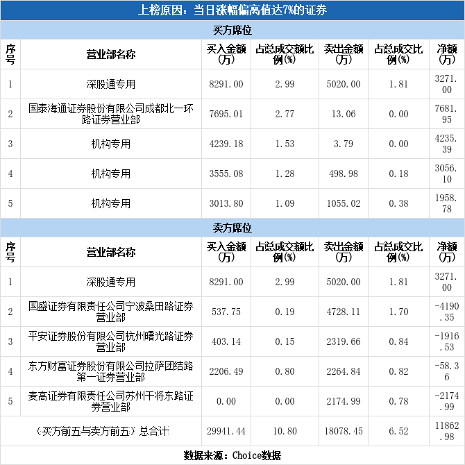 深交所2025年12月18日交易公开信息显示,浙江世宝因属于当日涨幅偏离值达7%的证券而登上龙虎榜。浙江世宝当日报收15.92元,涨跌幅为10.02%,偏离值达10.70%,换手率30.81%,振幅14.72%,成交额27.73亿元。