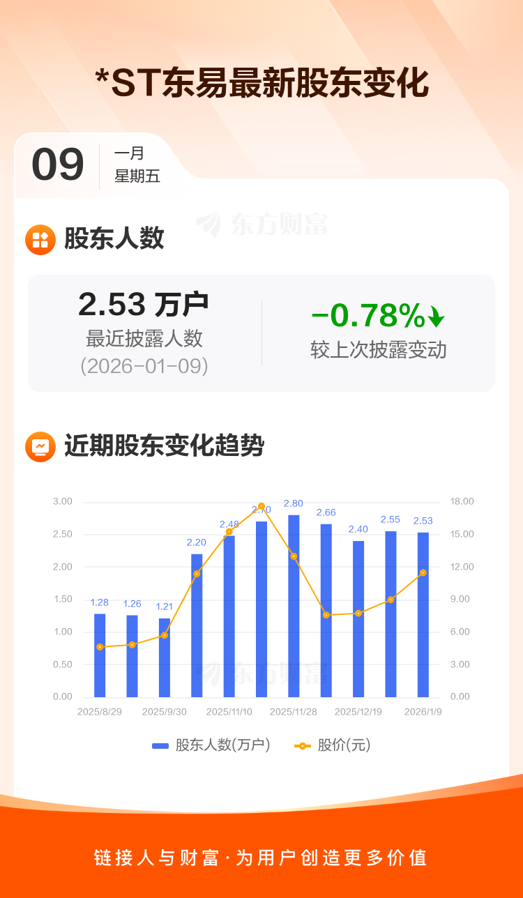 *ST东易最新披露数据显示,截至1月9日公司股东户数为2.53万户,较上期(2025年12月31日)减少200户,降幅为0.78%。户均持有流通股数量由上期的2.06万股上升至2.08万股,户均持股金额由上期的18.54万元增加至23.87万元。