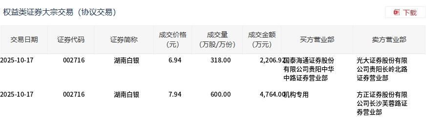 湖南白银今日大宗交易成交918万股,成交额6970.92万元