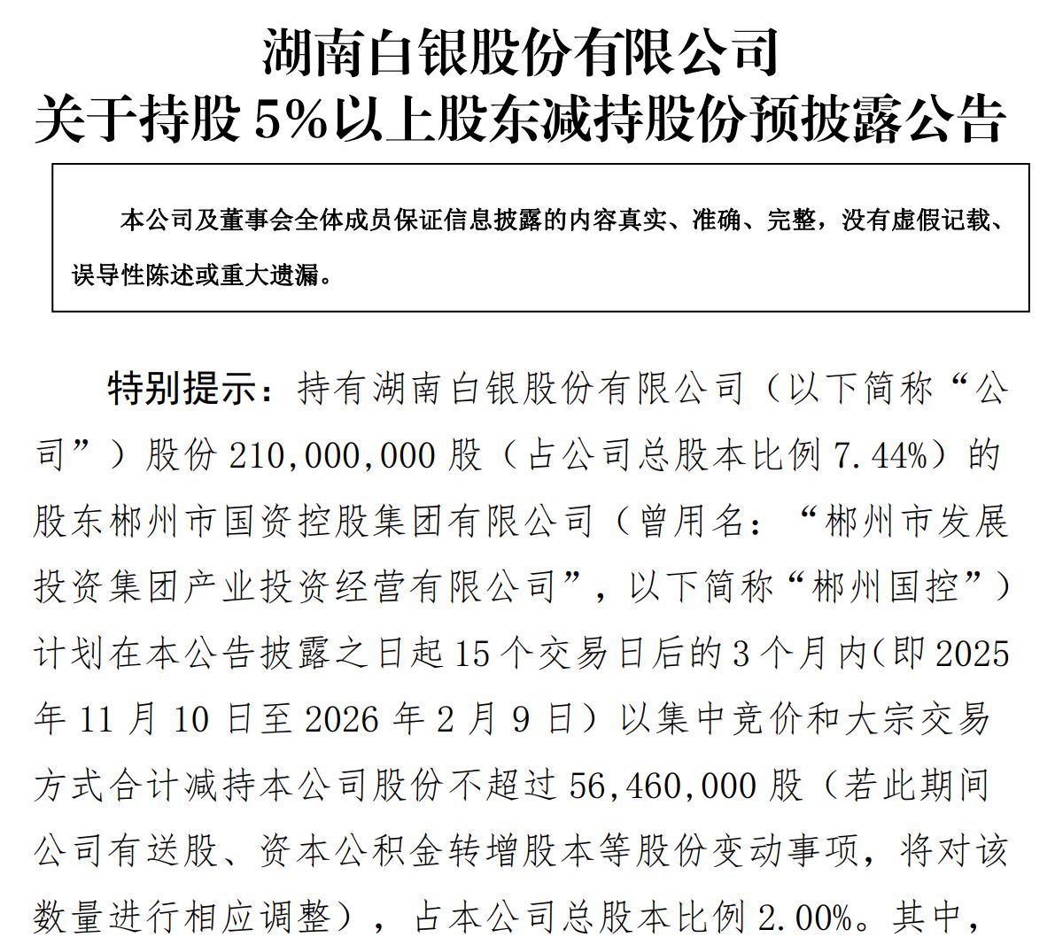 10月17日晚间,有色“牛股”湖南白银(SZ002716,股价8.04元,市值226.98亿元)公告称,因“自身经营和发展需要”,持股5%以上的第一大股东郴州市国资控股集团有限公司(以下简称“郴州国控”)计划在2025年11月10日至2026年2月9日期间,通过集中竞价和大宗交易方式减持公司股份不超过5646万股,占公司总股本的2%。
