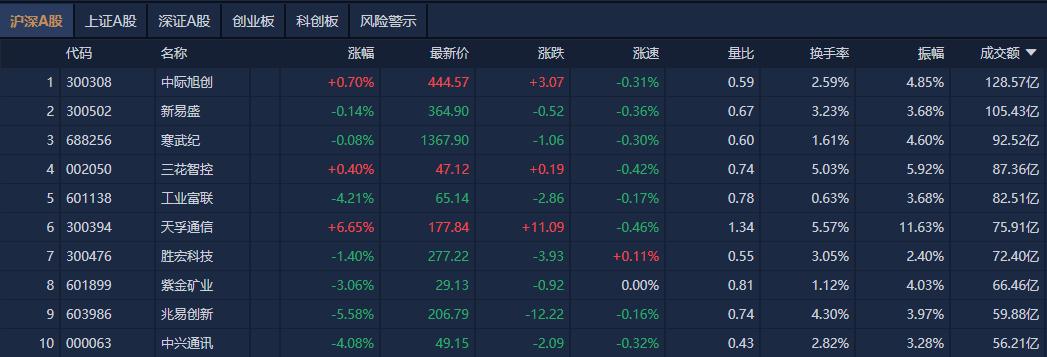 个股方面,中际旭创成交额超128亿元居首,新易盛、寒武纪、三花智控成交额靠前。