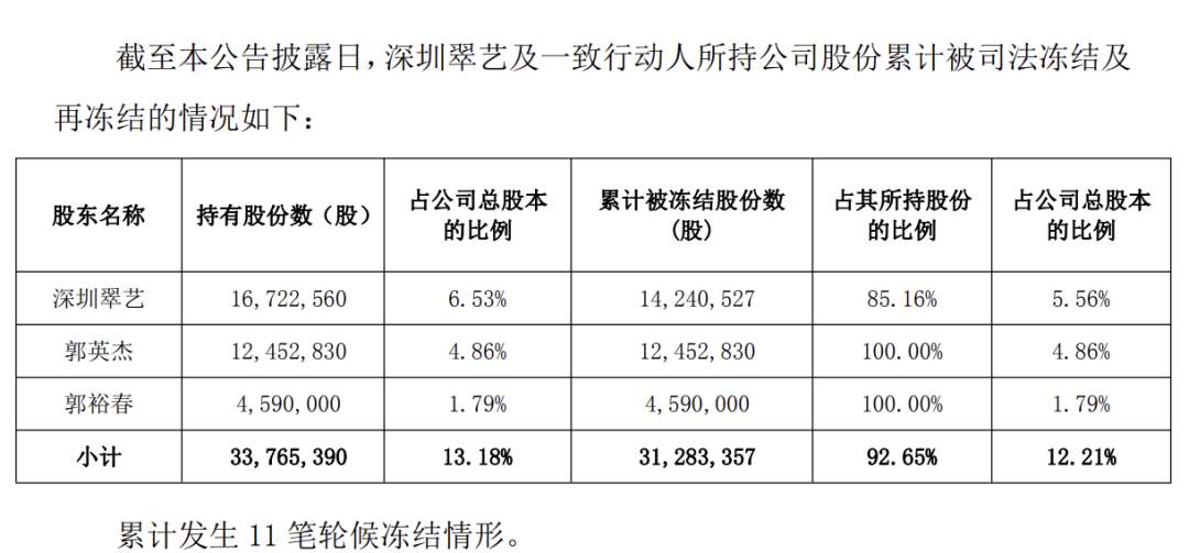 借款逾期的影响还蔓延至公司多位股东层面。2月6日晚间,萃华珠宝发布公告称,公司股东深圳翠艺、郭英杰、郭裕春所持股份遭司法冻结,累计冻结股份分别占公司总股本的5.56%、4.86%和1.79%。据同日公告,汉阳法院向广发营业部送达协助执行通知书,要求变现郭英杰所持公司股票中的256万股。