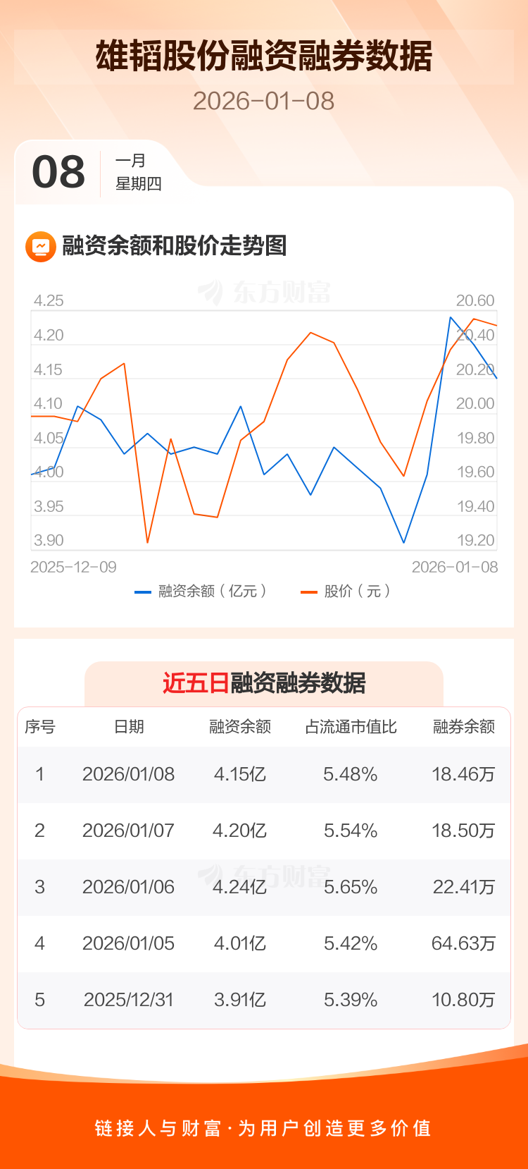 交易所最新数据显示,雄韬股份于2026年1月8日获融资买入2717.39万元,融资偿还3250.75万元,当日融资净偿还533.36万元。目前,该股融资余额4.15亿,占流通市值比例为5.48%。