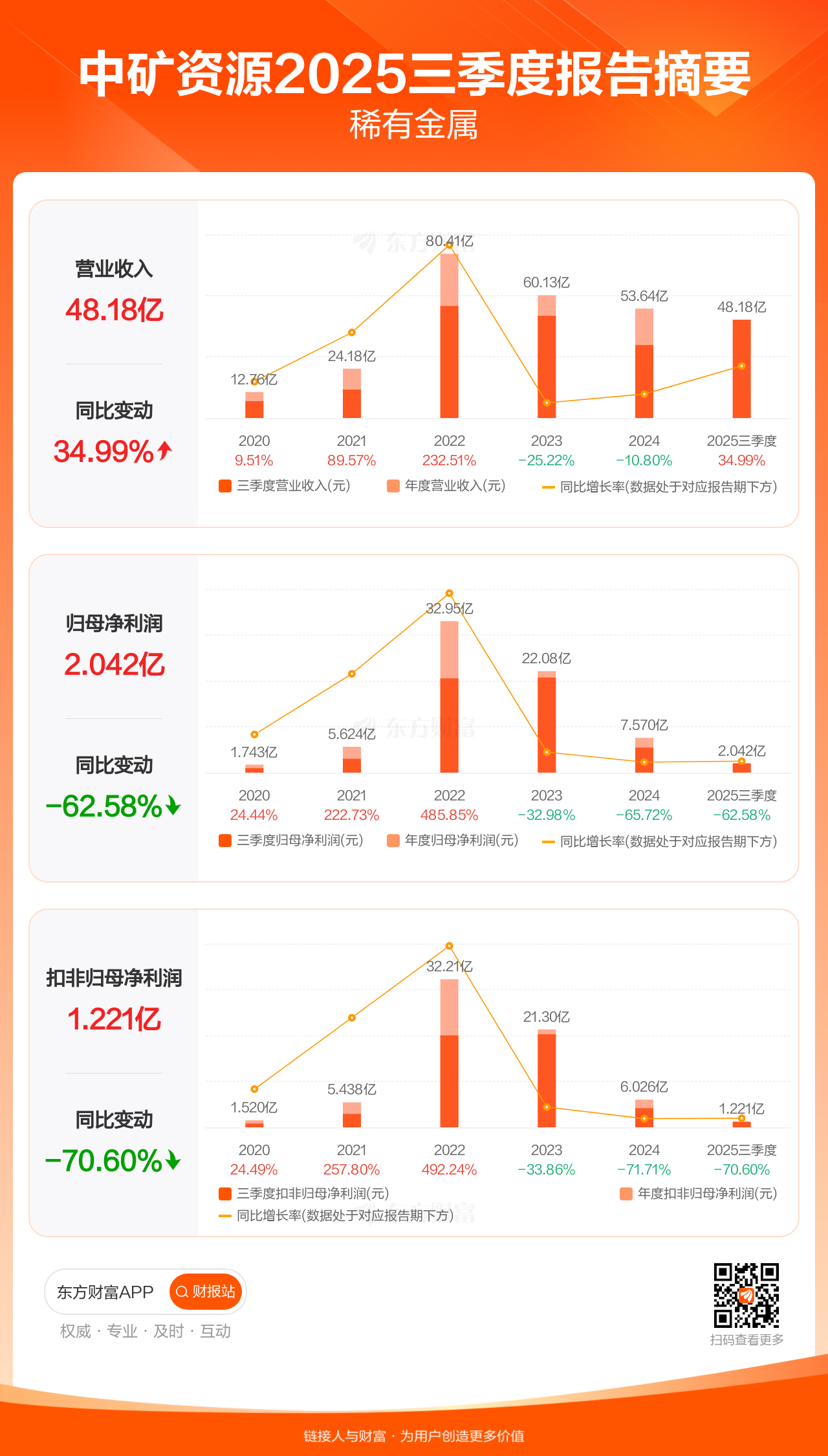 中矿资源10月28日发布2025年三季报显示,公司前三季实现营业收入48.18亿元,同比增长34.99%;归母净利润2.04亿元,同比下滑62.58%;扣非归母净利润1.22亿元,同比下滑70.60%。