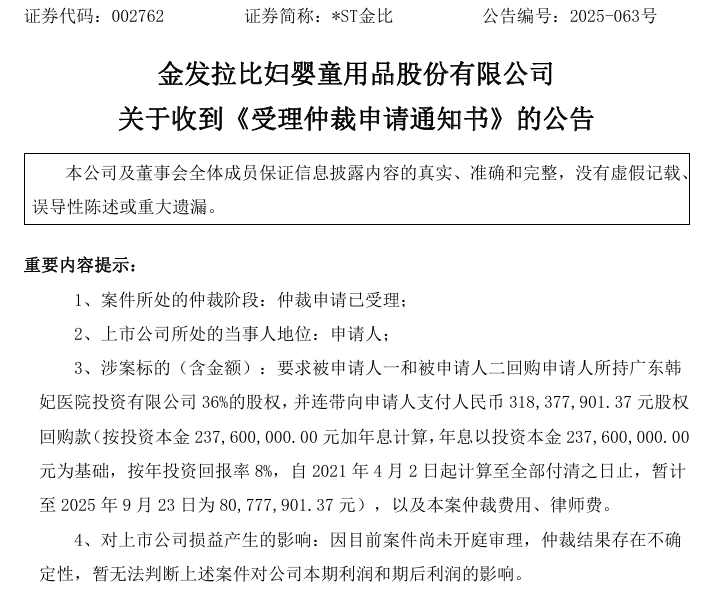 10月16日,*ST金比(002762)发布公告,近日公司收到汕头仲裁委员会的《受理仲裁申请通知书》。