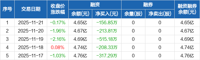 蓝黛科技融资融券信息显示,2025年11月21日融资净偿还156.85万元;融资余额4.65亿元,较前一日下降0.34%。