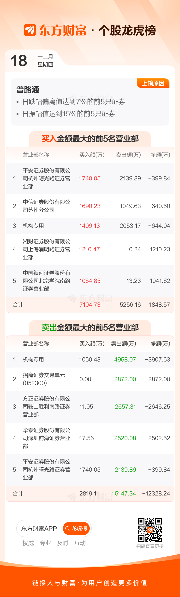 交易所2025年12月18日公布的交易公开信息显示,普路通因成为日跌幅偏离值达到7%的前5只证券、日振幅值达到15%的前5只证券上榜。普路通当日收报11.65元,涨跌幅-9.97%,偏离值-9.30%,换手率18.90%,成交额8.64亿。