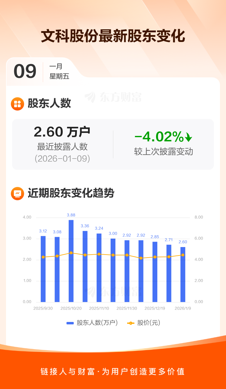 文科股份:截至1月9日最新股东户数2.60万户,较上期减少4.02%