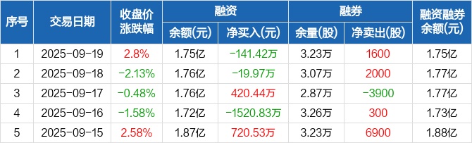 坚朗五金:融资净偿还141.42万元,融资余额1.75亿元(09-19)