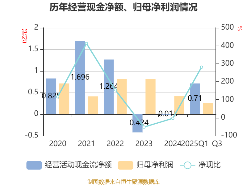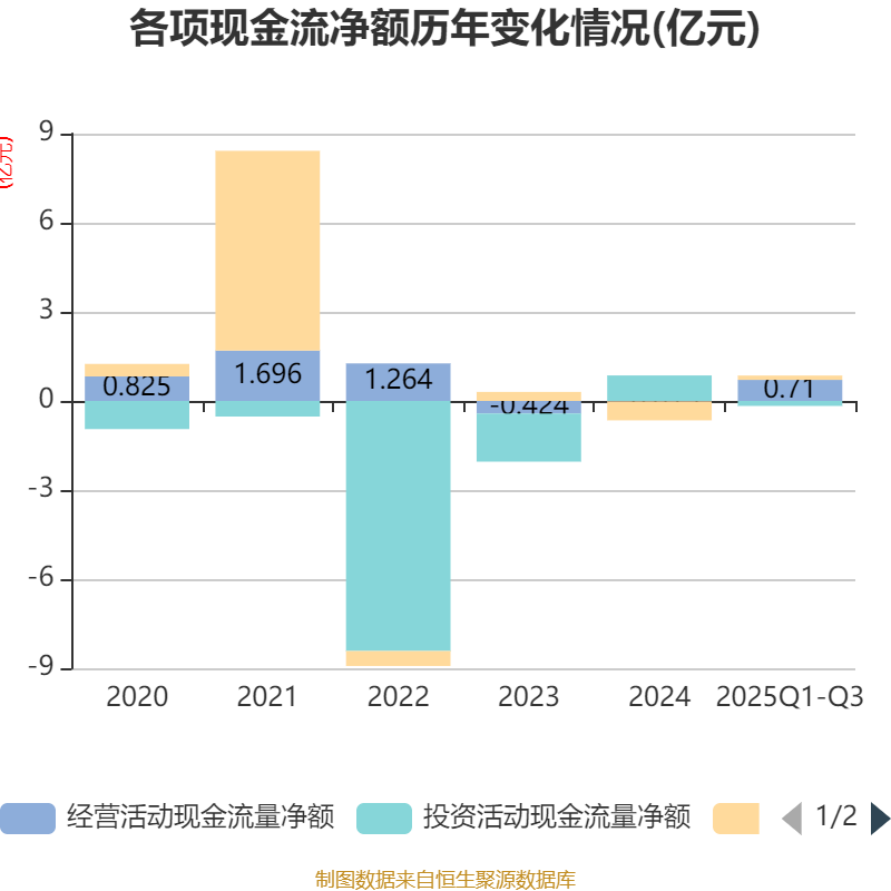 2025年前三季度,公司经营活动现金流净额为7100.67万元,同比增加1.38亿元;筹资活动现金流净额1457.75万元,同比增加1.15亿元;投资活动现金流净额-1676.64万元,上年同期为3.47亿元。
