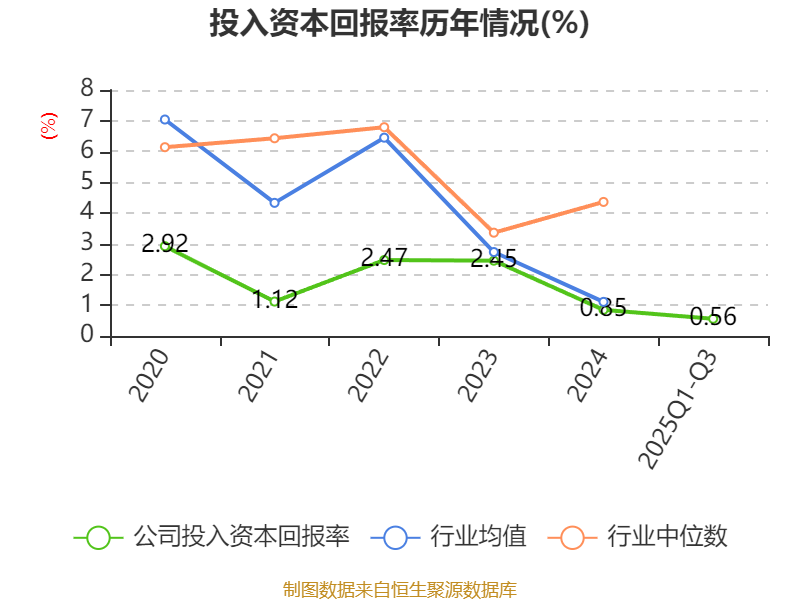 盈利能力方面, 2025年前三季度公司加权平均净资产收益率为0.01%,同比下降1.9个百分点。公司2025年前三季度投入资本回报率为0.56%,较上年同期下降0.82个百分点。
