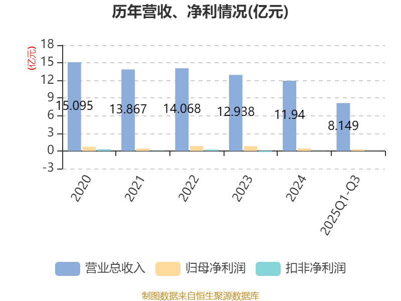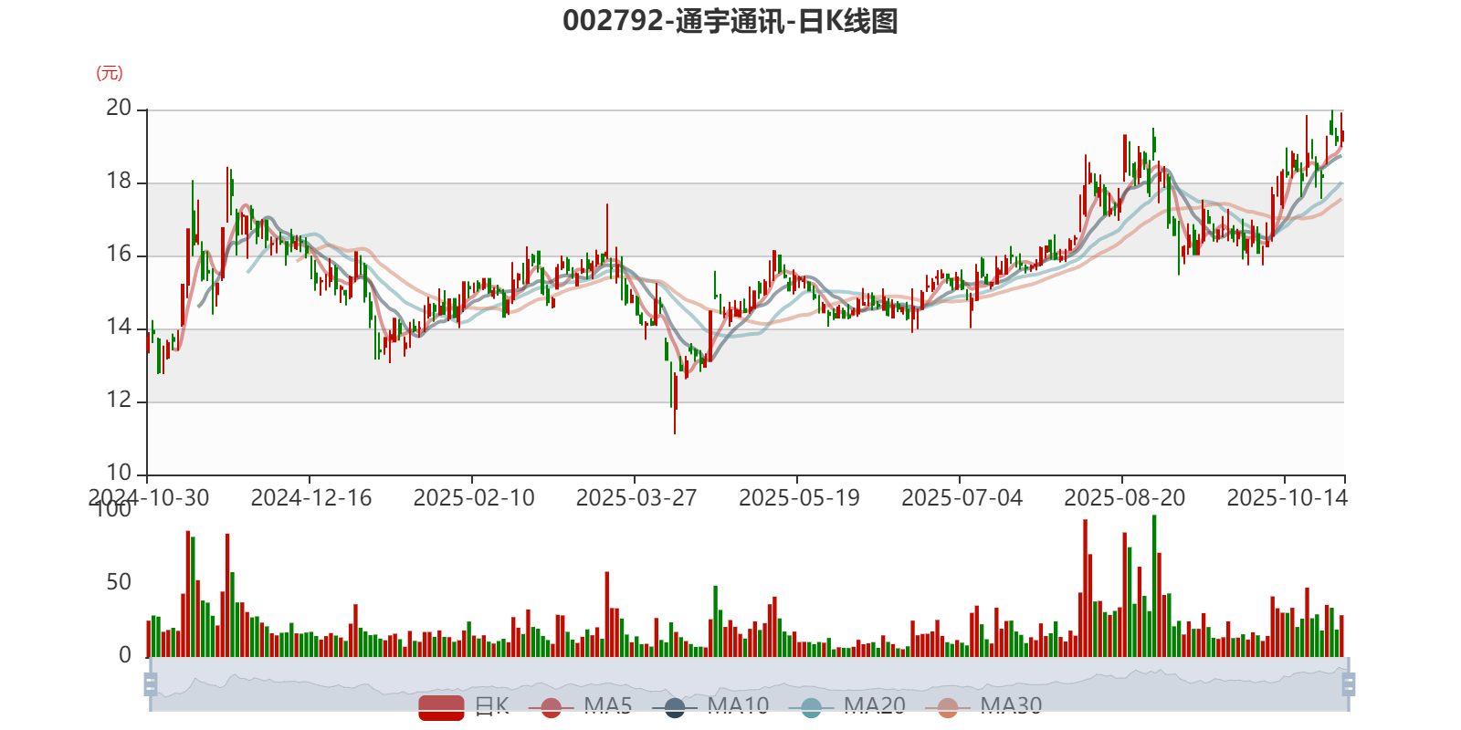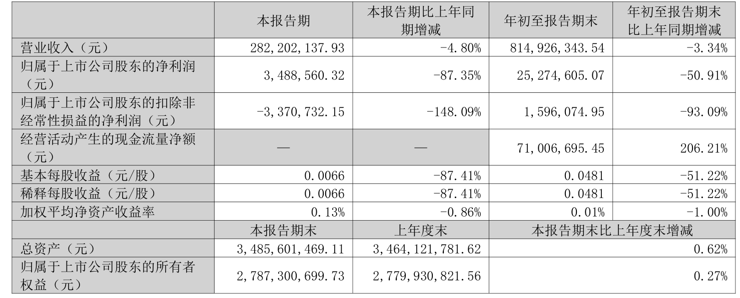 中证智能财讯通宇通讯(002792)10月30日披露2025年第三季度报告。前三季度公司实现营业总收入8.15亿元,同比下降3.34%;归母净利润2527.46万元,同比下降50.91%;扣非净利润159.61万元,同比下降93.09%;经营活动产生的现金流量净额为7100.67万元,上年同期为-6685.54万元;报告期内,通宇通讯基本每股收益为0.0481元,加权平均净资产收益率为0.01%。