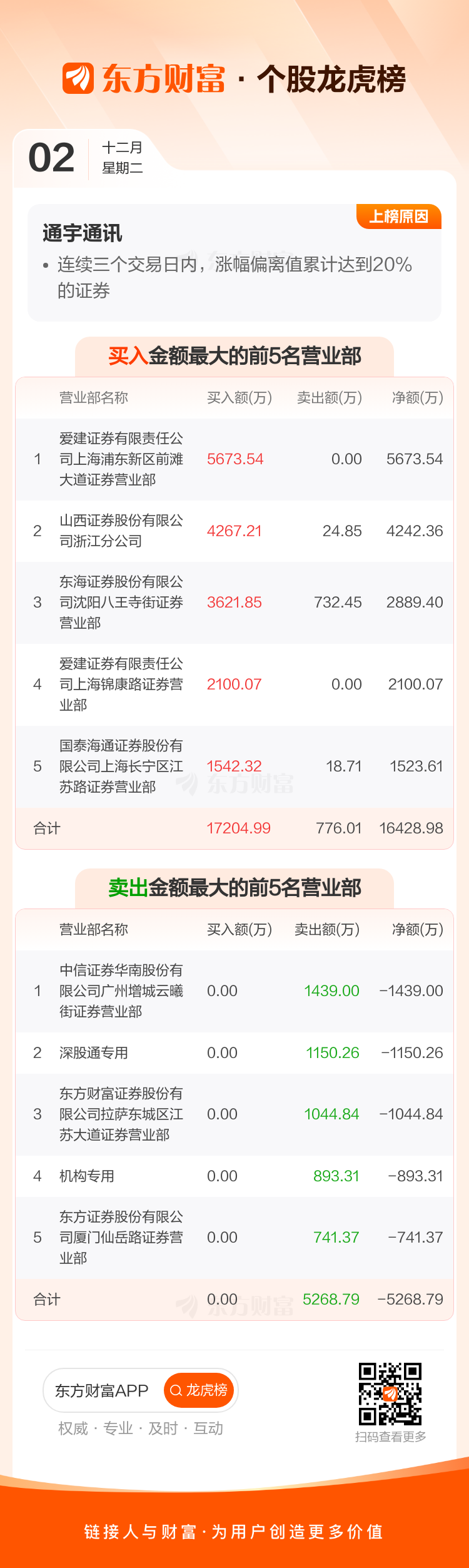 交易所2025年12月2日公布的交易公开信息显示,通宇通讯因成为连续三个交易日内,涨幅偏离值累计达到20%的证券上榜。通宇通讯当日收报28.78元,涨跌幅10.02%,换手率1.52%,成交额1.46亿。异常期间12月1日至12月2日,期间涨幅21.03%,累计偏离值20.68%,区间成交额2.26亿。