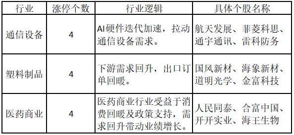 从行业特征来看,今日涨停板个股中,通信设备、塑料制品、医药商业行业的个股最多。