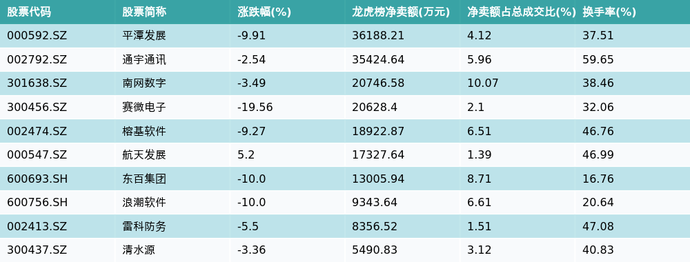 南财智讯12月3日电,南财金融终端数据显示,因当日异动登上龙虎榜的个股中,龙虎榜中资金净流出最多的前三位分别是平潭发展(000592.SZ)、通宇通讯(002792.SZ)与南网数字(301638.SZ)。其中排名第一的平潭发展被净卖出3.62亿元,占总成交金额的4.12%。平潭发展收盘下跌9.91%,换手率为37.51%。净卖出额前10个股详情见下图:
